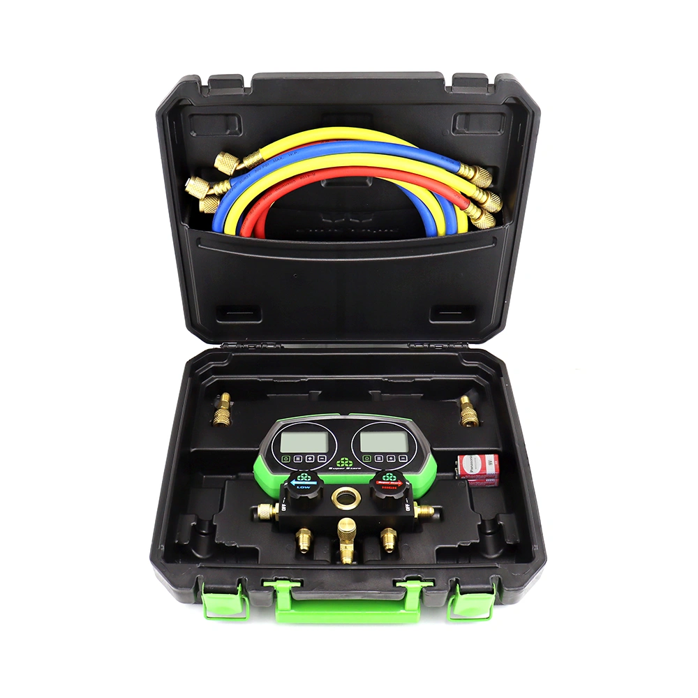 Profesjonalny, elektroniczny dwuzaworowy zestaw manometrów  ST-B268D przeznaczony do diagnostyki, serwisu i napełniania instalacji chłodniczych oraz klimatyzacyjnych. Urządzenie łączy w sobie funkcje pomiarowe ciśnienia roboczego, testów próżniowych oraz detekcji nieszczelności, co czyni go uniwersalnym narzędziem dla techników HVAC/R.